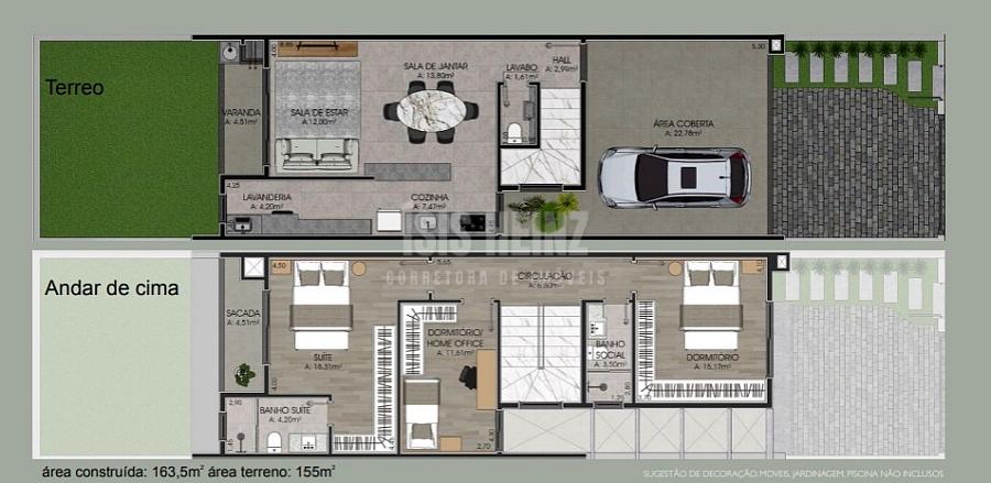 Sobrados compostos por 3 dormitórios, sendo 1 suíte, sala dois ambientes, cozinha americana, varanda com churrasqueira, lavabo, área de serviço, 1 banheiro social, pátio na frente e nos fundos e 3 vagas de estacionamento.